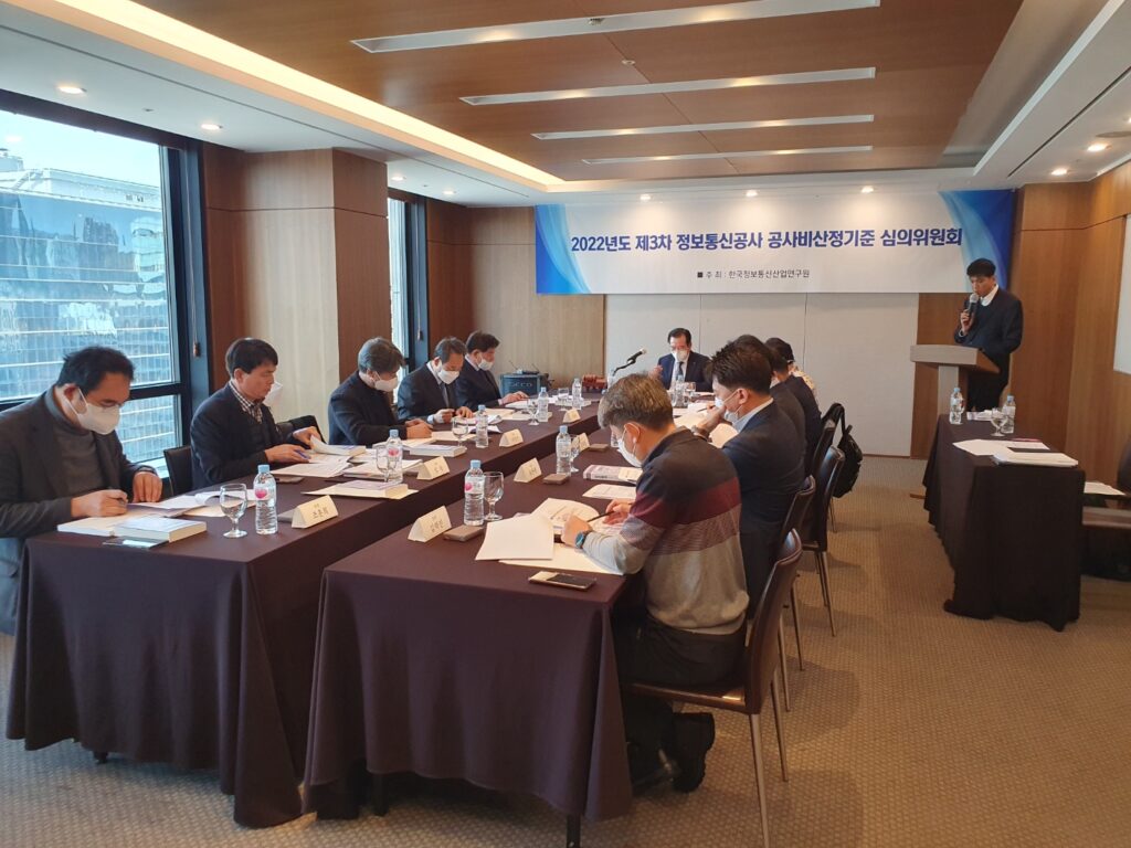 [연구원소식] 2022년도 제3차 정보통신공사 공사비산정기준 심의위원회 개최(2022.12.16.)가. 일 시 : 2022. 12. 16(금), 11:00 ~ 13:30 나. 장 소 : 한국프레스센터(시청역) 다. 참 석 : 위원 11명, 연구원 2명 라. 회의 주요내용 o 2023년도 적용 정보통신공사 표준품셈 제·개정(안) 심의 o 전차회의록 확인 및 주요업무보고 등 ※ 의결사항 o 2023년도 적용 정보통신공사 표준품셈 제·개정(안) 총 136개항