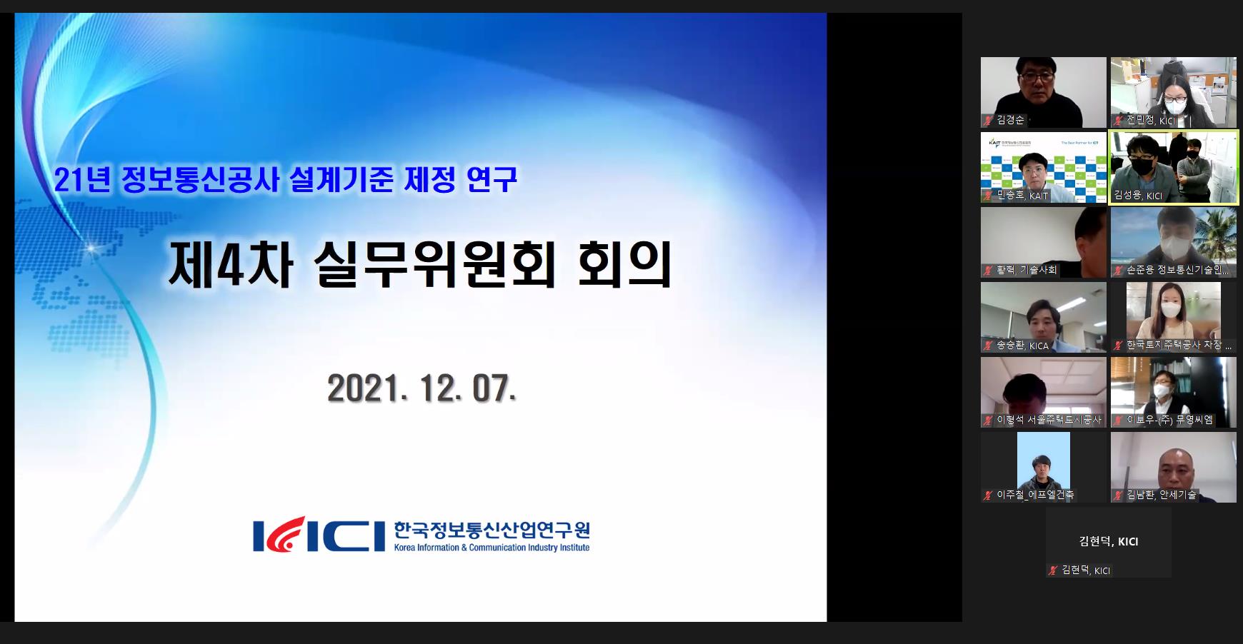 [연구원소식] 「2021년 제4차 표준설계설명서·공법 T/F실무 회의」개최가. 일 시 : 2021.12.07.(화) 11:00 ~ 12:00 나. 장 소 : 온라인 화상회의(코로나-19로 인해 온라인으로 대체) 다. 주요 안건 1) 정보통신공사 표준설계설명서·공법 개발연구 추진 현황 소개 및 보고 2) 연구 결과 검토 및 주요논의 사항 의견수렴