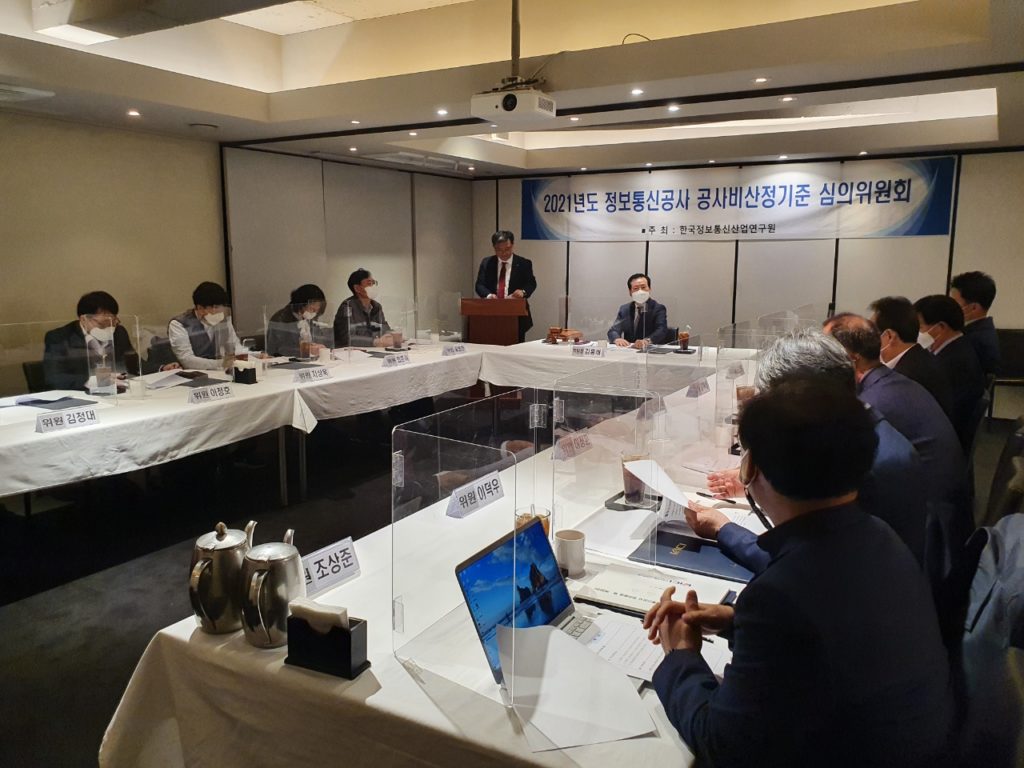 [연구원소식] 2021년도 제2차 정보통신공사 공사비산정기준 심의위원회 회의 개최(2021. 11. 15.)가. 일 자 : 2021. 11. 15(월) 11시 나. 장 소 : 컨퍼런스하우스 달개비 다. 참 석 : 공사비산정기준 전문위원회 위원 11명 참석 라. 회의 주요내용 o 2021년도 정보통신공사 표준품셈 제·개정(안) 심의 o 전차회의록 확인 및 주요업무보고 o 기타토의 등 ※ 의결사항 o 2021년도 정보통신공사 표준품셈 제·개정(안) 총 55개