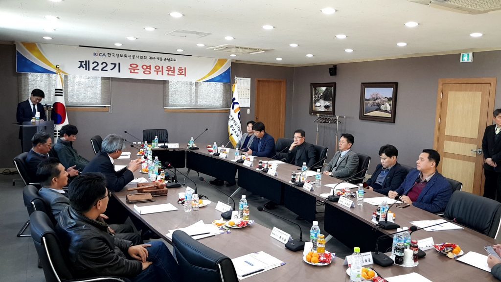 [연구원소식] 정보통신공사업 경기실사지수 및 실태조사 연구 관련 대전∙세종∙충남도회 심층면접 회의 개최가. 일 시 : 2019. 11. 22 (금), 10:30 나. 장 소 : 한국정보통신공사협회 대전∙세종∙충남도회 다. 참 석 자 : 대전∙세종∙충남도회 김일수 도회장 외 운영위원 및 직원 18명, 연구원 2명 라. 주요내용 o 연구원 소개 및 정보통신공사업 경기실사지수 및 실태조사 연구 배경, 취지 설명 o 대전∙세종∙충남 지역 공사업 관련