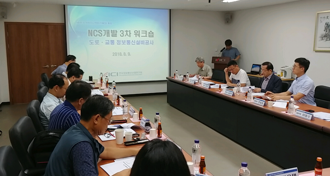 [연구원소식] NCS 및 활용패키지 개발용역(도로·교통정보통신설비공사) 3차 개발워크숍가. 일 시 : 2018. 08. 09.(목) 10:00 나. 장 소 : 한국정보통신산업연구원 회의실 다. 참 석 자 : 퍼실리테이터 1명 및 개발위원 9명 등 총 16명 라. 회의 주요내용 1) NCS 개발(안) 검토 논의 및 확정 2) NCS 개발(안) 표준화 작업 3) 개발워크숍 결과에 대한 WG 심의위원회 회신 의견 논의