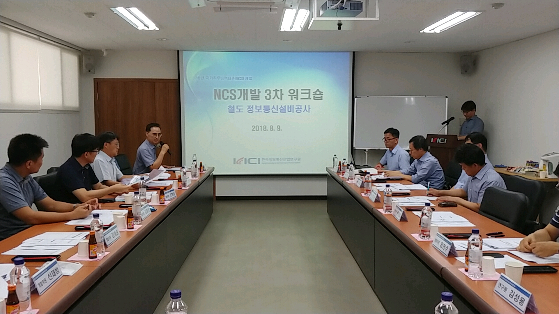 [연구원소식] NCS 및 활용패키지 개발용역(철도정보통신설비공사) 3차 개발워크숍가. 일 시 : 2018. 08. 09.(금) 15:00 나. 장 소 : 한국정보통신산업연구원 회의실 다. 참 석 자 : 퍼실리테이터 1명 및 개발위원 11명 등 총 18명 라. 회의 주요내용 1) NCS 개발(안) 검토 논의 및 확정 2) NCS 개발(안) 표준화 작업 3) 개발워크숍 결과에 대한 WG 심의위원회 회신 의견 논의