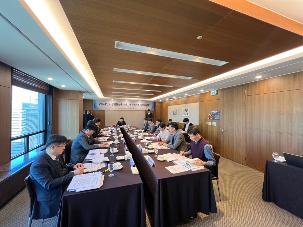 [연구원소식] 2024년도 제3차 「정보통신공사 공사비산정기준 심의위원회」 회의 개최(24.12.5.)가. 일 시 : 2024. 12. 5.(목), 11:00 ~ 13:55 나. 장 소 : 한국프레스센터, 19층 회의실 다. 참 석 : 정보통신공사 공사비산정기준 심의위원회 위원 14명 라. 주요 내용 o ‘25년도 적용 정보통신공사 표준품셈 제·개정(안) 심의