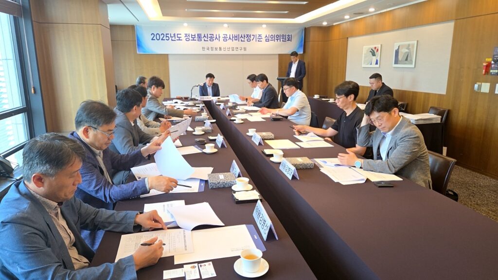 [연구원소식] 2025년도 제1차 「정보통신공사 공사비산정기준 심의위원회」 회의 개최(25.06.19.)가. 회의일시 : 2025.06.19.(목), 10:30 ~ 13:00 나. 회의장소 : 한국프레스센터 국화실(시청역) 다. 참 석 : 공사비산정기준 심의위원 13명 등 총 16명 라. 주요내용 : ’25년도 하반기 적용 정보통신공사 표준시장단가 검토ㆍ심의