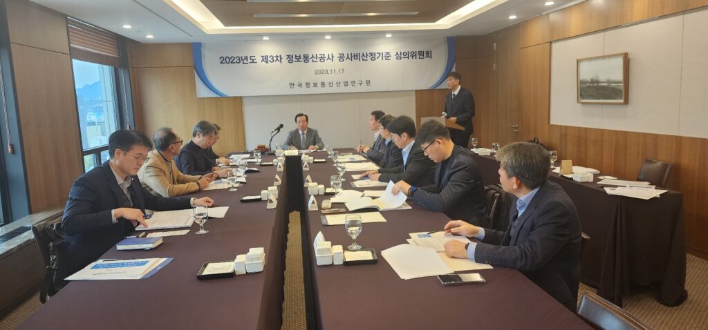 [연구원소식] 2023년도 제3차「정보통신공사 공사비산정기준 심의위원회」개최(23.11.17)가. 일 자 : 2023. 11. 17(금) 나. 장 소 : 한국프레스센터(서울시청역 인근), 19층 목련실 다. 참 석 : 재적위원 15명중 10명 참석 라. 주요 내용 o ‘24년도 상반기 표준시장단가 검토·심의 o 심의의안 의결(원안대로 의결) 등