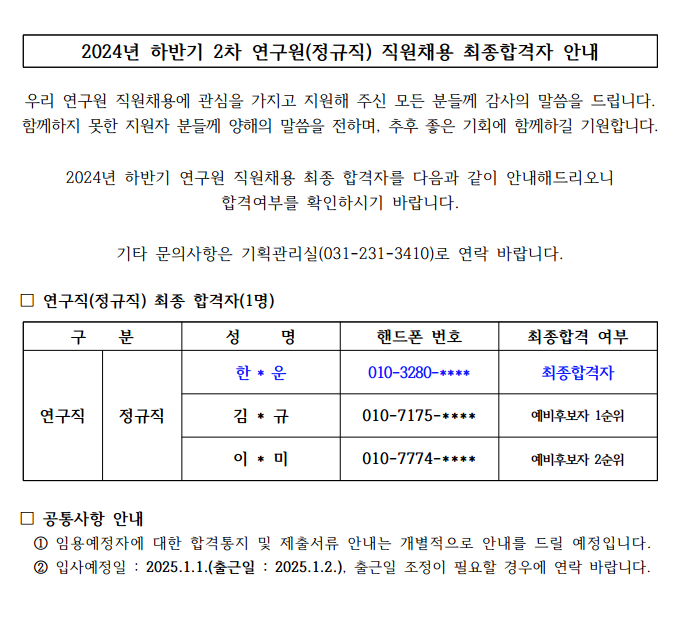 [채용공고] 마감 2024년 하반기 2차 연구원(정규직) 직원채용 최종합격자 안내