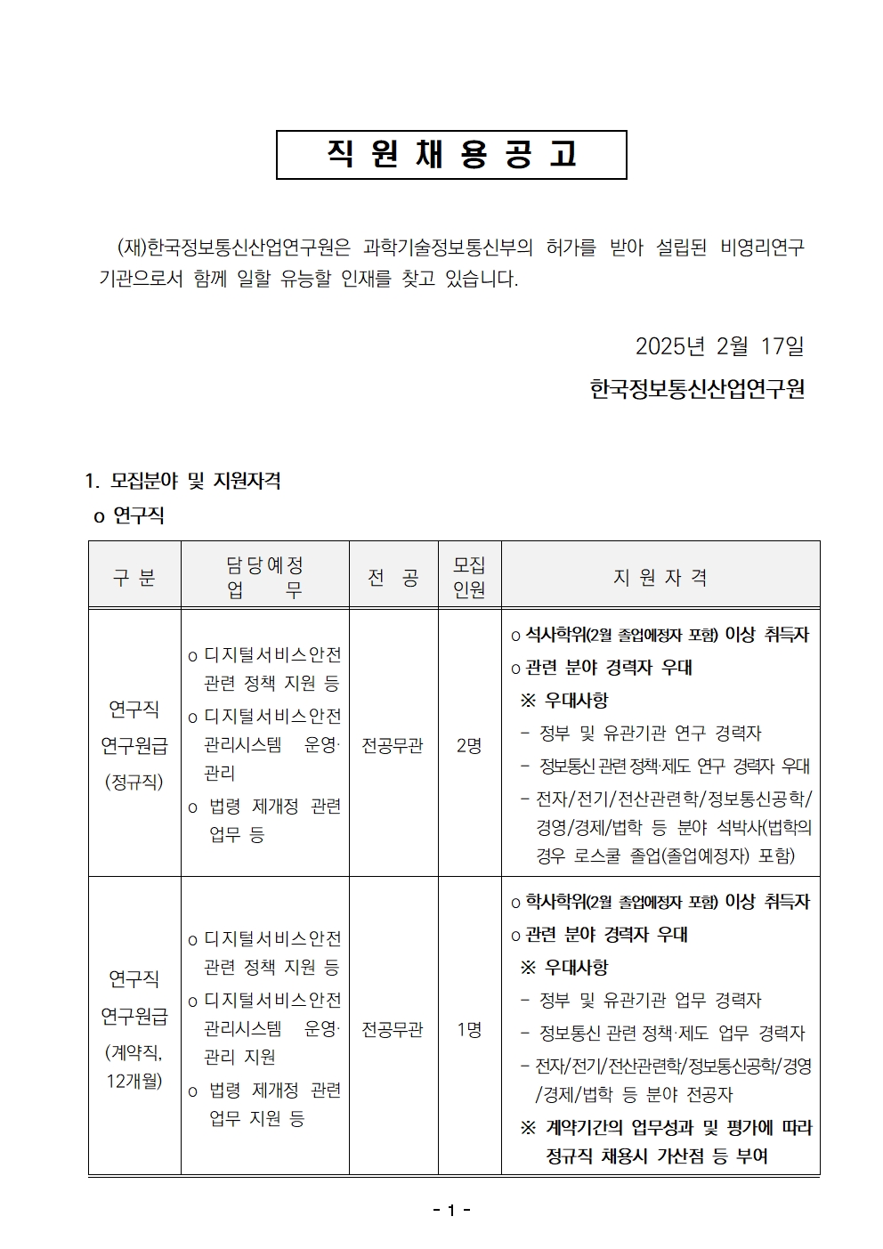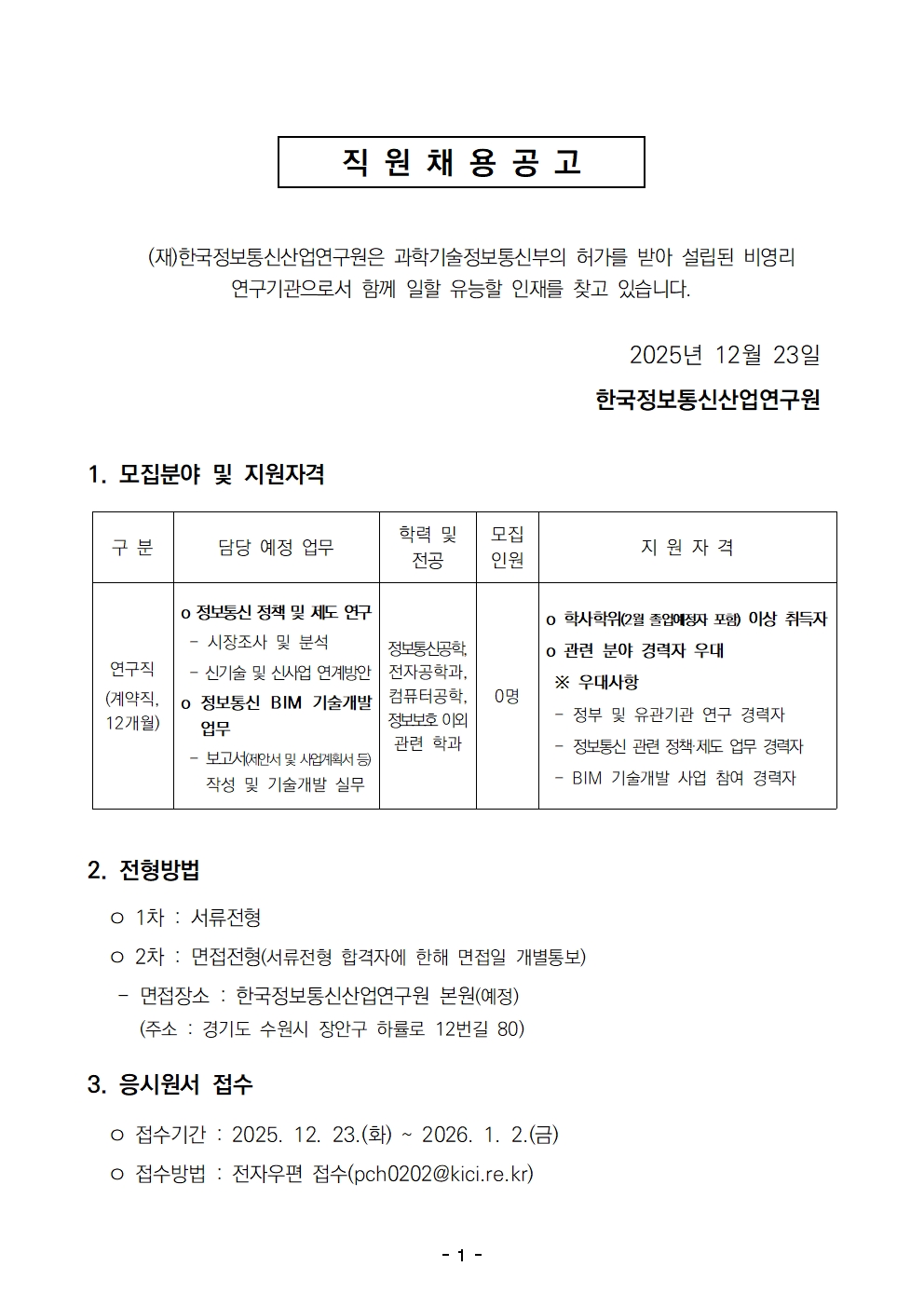 [채용공고] 마감 2025년 하반기 연구원(계약직) 모집 공고 안내(2026.1.2까지) -