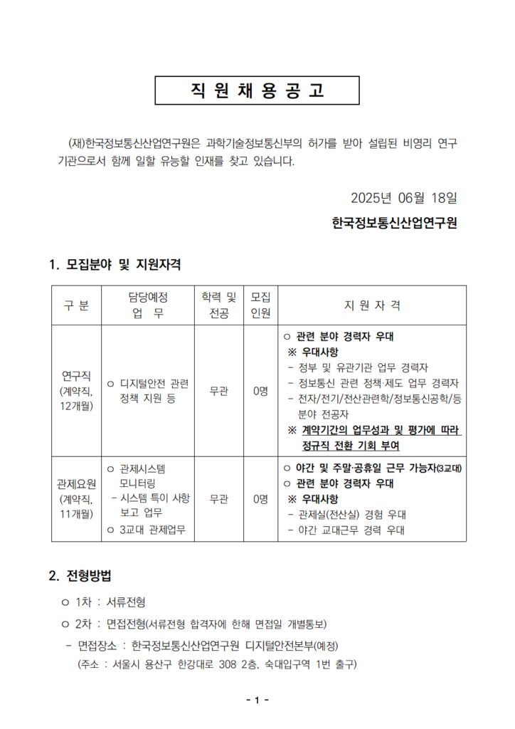 [채용공고] 마감 2025년 상반기 연구원 및 관제요원 모집 공고 안내(2025.6.23.(월) 12:00까지) -