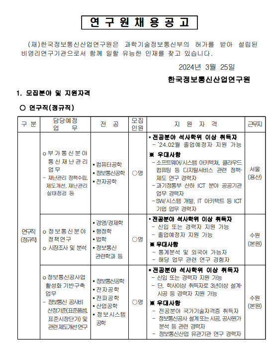 [채용공고] 마감 [마감] 2024년 상반기 연구원(정규직, 계약직) 모집 공고 안내(2024.4.7까지) -