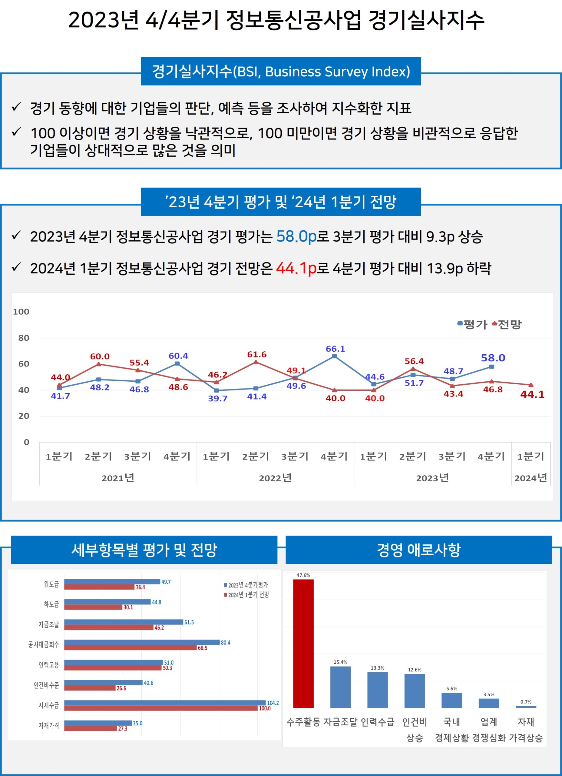 ■ 2024년 1분기 정보통신공사업 경기전망 지수는 2023년 4분기 경기평가(58.0p) 대비 13.9p 하락한 44.1p를 기록