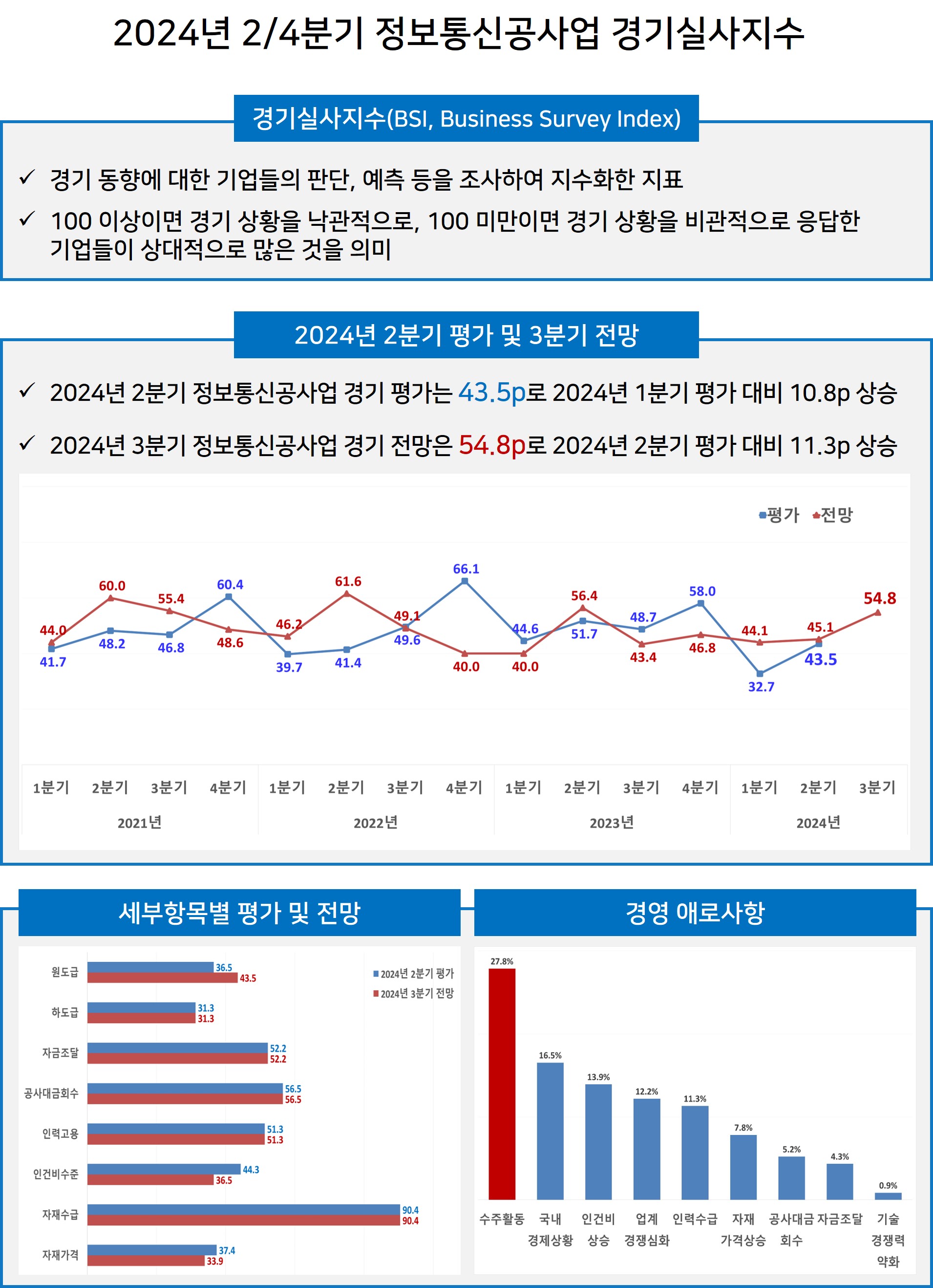 ■ 2024년 3분기 정보통신공사업 경기전망 지수는 2024년 2분기 경기평가(43.5p) 대비 11.3p 상승한 54.8p를 기록
