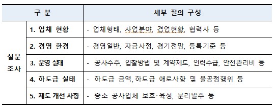 ㅇ 설문조사의 내용은 경영환경, 공사업 관련 운영실태, 하도급 실태 및 공사업 관련 제도개선 등에 관한 질문으로 구성되었으며, 심층면접은 주요 발주처별 발주현황 및 경영 애로사항에 관하여 질의와 응답이 이루어짐
