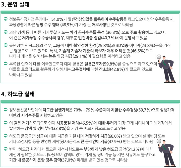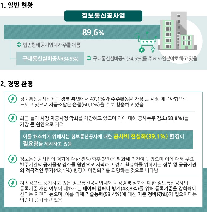 □ 2011년부터 2022년까지 과기정통부의 '정보통신공사업 활성화 기반구축' 사업의 일환으로 매년 추진해 온 연도별 실태조사 데이터 기반의 '정보통신공사업 실태조사 통계백서' 보고서를 통해, 해당 기간 동안의 정보통신공사업의 부문별 실태를 크게 다음과 같이 종합함